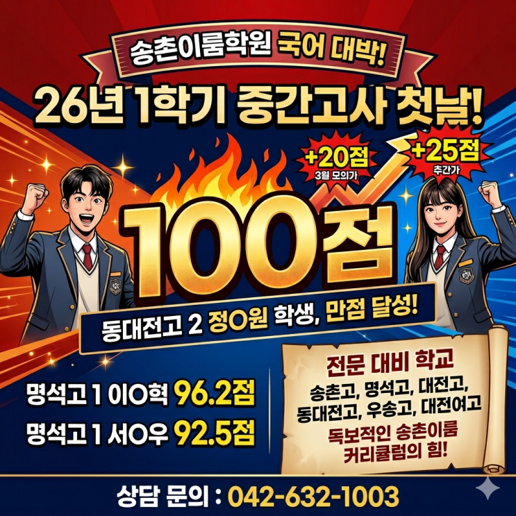 노력은 학생이! 방향은 송촌이룸학원이! 안녕하세요, 송촌이룸학원입니다. 2026년 1학기 중간고사가 드디어 4월 24일, 첫 시작을 알렸습니다. 그리고 시험 첫날, 저희 학원에서는 정말 기분 좋은 소식들이 이어졌습니다. “결과로 증명되는 학원” 그 말이 단순한 홍보가 아니라는 것을 이번 시험이 다시 한번 보여주었습니다. 중간고사 첫날, 성적 결과 공개 4월 24일 국어 시험 (동대전고 / 명석고) 동대전고 2학년 정O원 100점 (만점) 단 2개월 만에 +25점 상승 명석고 1학년 이O혁 96.2점 명석고 1학년 서O우 92.5점 ✔ 고1 첫 시험부터 90점대 ✔ 고2는 단기간 만점 달성 결과....... <img src="https://blogthumb.pstatic.net/MjAyNjA0MjVfMTM2/MDAxNzc3MTI2MTQ0NDIw.2XI0t311-pieLWKqG03rv43tPHkIb6UXRgJ65mzYFZog.tFYVo5ERdccjTKm95_XupwWQudz24mYoPgUFNiMNk34g.PNG/Gemini_Generated_Image_nucacqnucacqnuca.png?type=s3" />