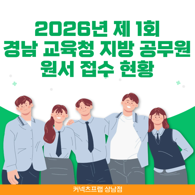 안녕하세요. 커넥츠프랩 창원점입니다. 오늘은 2026년도 제 1회 경남 교육청 지방 공무원 임용 시험 원서 접수 현황에 대해 안내해 드리려고 합니다. 접수 결과 1) 교육 행정 ① 선발 예정 - 112명 ② 접수 인원 - 1,109명 ③ 경쟁률 - 9.90 : 1 2) 전산 ① 선발 예정 - 5명 ② 접수 인원 - 54명 ③ 경쟁률 - 10.80 : 1 3) 사서 ① 선발 예정 - 10명 ② 접수 인원 - 135명 ③ 경쟁률 - 13.50 : 1 입니다. 남은 기간 마무리 잘 하셔서 원하는 결과 이루길 응원하겠습니다. 원활한 상담을 위해 예약 후 방문 부탁드립니다. 상남점 ☏ 055-262-0099 합성점 ☎ 055-252-0034 <img src="https://blogthumb.pstatic.net/MjAyNjA0MjJfMTE4/MDAxNzc2ODMxMzg5ODg4.ZmpKJfjhqPMGOkckYEhz16Kc9InO47pgkRcIvV1AQIgg.Wm8ThGLE-BRUQY14T_tQNGsfJzHqX59OEVyeWUAUH6kg.PNG/%C1%A6%B8%F1%C0%BB_%C0%D4%B7%C2%C7%D8%C1%D6%BC%BC%BF%E4..png?type=s3" />
