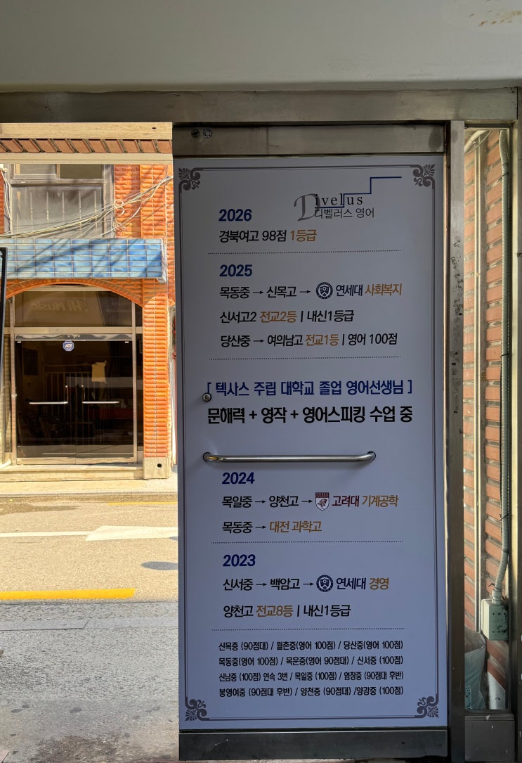 목동 디벨러스 영어 2023 부터 현재 까지의 성과 및 입결 2026 4월 현재 2026 경복여고 98점 내신 1등급 2025 신목고, 연대 합격자 배출, 2026 연대 사회복지 입학 2025 신서고 전교 2등 내신 1등급 여의도고 전교 1등 영어 100점 2024 양천고 연대 고대 동시 합격자 배출 , 2025 고대 기계공학 입학 2024 목동중 , 대전 과학고 입학 2023 백암고 , 올해 연대 고대 입학자 배출, 2024 연대 경영 입학 양천고 전교 8등 2022 양천고, 당시) 영어 내신1등급, 2021 중앙대 입학자 배출 https://naver.me/xUFOcaJB 서술형 레벨 테스트지(초5-고1) 로 아이 상황 파악하기 * 양식을 채우시면, 초5 - 고1 까지 보는 서술형 레벨 테스트지를 메일로 보내드....... <img src="https://blogthumb.pstatic.net/MjAyNjA0MzBfOTUg/MDAxNzc3NTQxNzE3MDM2.f8pJVPMl5rjNoYOKbaVOJ3yJl8jrh_Xd49DUDyr21zog.2tkx_nmPXUZG-wAPX2qumzX-T6GWXMOEdAdHtqcVGU0g.JPEG/KakaoTalk_20260430_183024055.jpg?type=s3" />