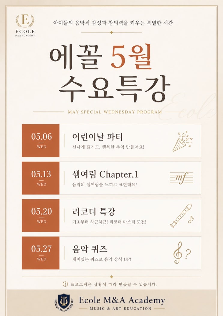 에꼴 5월 수요특강 안내 아이들의 즐거움과 성장을 함께하는 에꼴 5월 특별 프로그램이 시작됩니다! 놀이처럼 즐기며 배우고, 경험 속에서 자신감을 키우는 시간✨ ✔ 어린이날 파티부터 ✔ 셈여림 표현 수업 ✔ 리코더 특강 ✔ 음악 퀴즈까지! 아이들이 기다리는 수요일이 될 거예요 일정 안내 5월 6일 – 어린이날 파티 5월 13일 – 셈여림 Chapter.1 5월 20일 – 리코더 특강 5월 27일 – 음악 퀴즈 ※ 프로그램은 상황에 따라 변동될 수 있습니다. #예원학교 #계원예중 #선화예중 #입시미술예중예고 #초등부콩쿨 #피아노개인레슨 #선화예중교복가격 #입시피아노레슨 #5월1일공휴일 #5월날씨 <img src="https://blogthumb.pstatic.net/MjAyNjA0MjRfMTYg/MDAxNzc2OTU3NTI4OTI4.r7N2qCEcBjBaKcTo3o1wGjEOzScOjUF9dbydfCgtdj0g.YYU80Ak9Rg5X1krH69x7CMFxbd0E_90lAlpH4rWdW8sg.JPEG/2C76F6E0%A3%AD4BF7%A3%AD4DB9%A3%AD8184%A3%AD1A67CB4AF2F9.jpg?type=s3" />