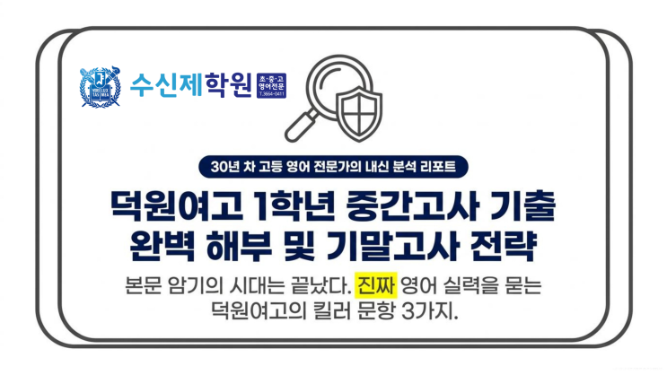 [30년 차 영어 전문가의 내신 분석] 안녕하세요, 30년 차 고등 영어 전문가 수신제 학원 원장입니다. 오늘은 방금 마무리된 2026학년도 덕원여자고등학교 1학년 1학기 중간고사 공통영어1 시험지를 철저하게 분석해 보겠습니다. 덕원여고 진학을 앞둔 예비 고1 학생들과 학부모님, 그리고 기말고사를 대비해야 하는 재학생들에게 핵심적인 길잡이가 될 것입니다. 이번 덕원여고 영어 시험은 단순히 지문을 암기해서는 절대 고득점을 받을 수 없는, '진짜 영어 실력'을 묻는 수준 높은 문항들로 구성되었습니다. 1. 시험 전체 개요 및 문항 구성 이번 중간고사는 선택형(객관식) 20문항(70점)과 서·논술형 6문항(30점)으로 출제되었습니....... <img src="https://blogthumb.pstatic.net/MjAyNjA0MjFfMjU5/MDAxNzc2NzYwMzUzNjgy.tmgfN301exyEvSfVbFTlq2CurtgdlXvduLOOA4LhPPAg.Lb141c71KFRdINQ8cteOrXZJ2o7MV0HIE1jlq5uPP94g.PNG/clean_Deokwon_English_Strategic_Blueprint_%281%29_1.png?type=s3" />