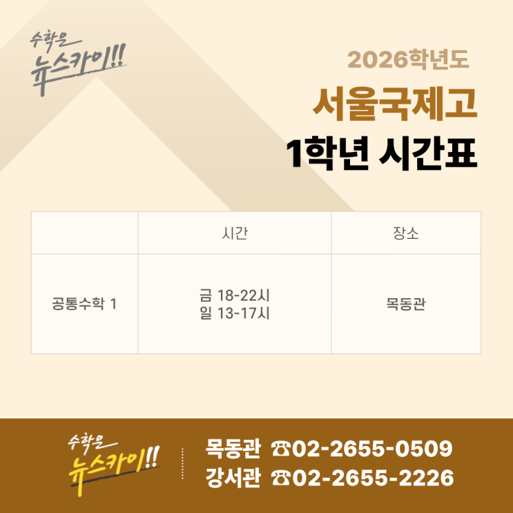 안녕하세요 수학을 바꾸는 학원, 뉴스카이 수학학원입니다. 2026학년도 서울국제고 학생들을 위한 학년별 수학 수업 시간표를 안내드립니다. 서울국제고는 내신 난이도와 서술형 비중이 높은 학교이기 때문에 체계적인 대비가 무엇보다 중요합니다. 1학년 시간표 (공통수학1) ✔ 과목 : 공통수학 1 ✔ 시간 : 금요일 18:00 ~ 22:00 일요일 13:00 ~ 17:00 ✔ 장소 : 목동관 고등학교 첫 시험을 대비하는 가장 중요한 시기입니다. 기초 개념 + 학교 시험 유형 적응이 핵심입니다. 2학년 시간표 (대수 + 수1) ✔ 과목 : 대수 / 수학Ⅰ ✔ 시간 : 금요일 18:00 ~ 22:00 일요일 13:00 ~ 17:00 ✔ 장소 : 목동관 본격적인 내신 경....... <img src="https://blogthumb.pstatic.net/MjAyNjA0MTJfMTYg/MDAxNzc1OTg1OTQ5NTkz.AkO7MvGWNCprPPGp6KSWQPajRM4RfsyaMvtSCVDt9qog.UPnFnxCOU9mBf4e9NG6M-z1VBSjjBwB8gGxenFmDaHAg.PNG/003.png?type=s3" />
