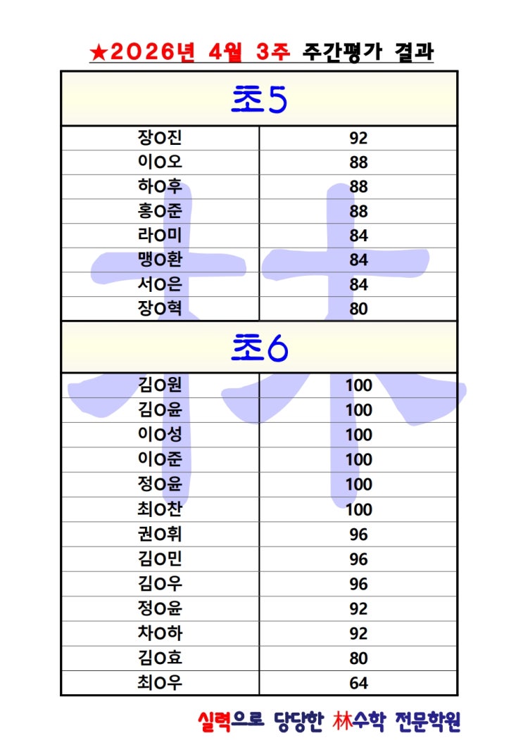 안녕하세요. 임수학 전문학원입니다. 4월 3주 주간평가 결과를 안내드립니다. 이번 주 주간 테스트를 통해 학생들의 꾸준한 성장을 다시 한번 확인할 수 있었습니다. 배운 내용을 바탕으로 성실하게 학습을 이어가며 한 걸음씩 실력을 쌓아가는 학생들을 응원합니다~ 궁금하신 점이 있으시면 언제든지 편하게 연락 주세요. 감사합니다. <img src="https://blogthumb.pstatic.net/MjAyNjA0MjVfMjI0/MDAxNzc3MDc1NTg2NTQx._ba4TgN5q427x6jqjYpZeQkEbGp_rWD5KC_pbAHQ27Qg.CvoIHkrB62_Mohh5NlEhgDhsbYzEr_YrbsK7F39If4og.JPEG/26%B3%E2_4%BF%F9_3%C1%D6_%C1%D6%B0%A3%C6%F2%B0%A1%B0%E1%B0%FA_%B0%D4%BD%C3%BF%EB_1.jpeg?type=s3" />