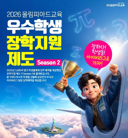 안녕하세요. 청라호수 유투엠입니다^^ 두 둥~~~ 드디어 26년도 우수학생 장학지원 제도 시즌2가 시작되었습니다. 작년부터 올림피아드교육에서 시작한 야심찬 장학지원 제도가 있죠~~~ 올해 더 업그레이드가 되어 시즌2로 찾아왔습니다. 매분기마다 우수한 학생을 선발하여, 삼성전자 주식과 아이비리그탐방 장학혜택을 제공한다고 합니다. 자세한 내용은 아래를 참고해주세요. 새학기를 맞이하여 마음을 다잡고 수학공부에 전념을 한다면, 이번 분기 장학생은 우리학생들이 차지하겠죠.~ 대상에게 주어지는 장학제도는 우리가 익히 들어서 알고 있는 아이비리그(미국 북동부지역 8개 명문사립대학)을 탐방하는 일정으로, 그야말로 우리가 꿈꾸는....... <img src="https://blogthumb.pstatic.net/MjAyNjA0MDdfMjMw/MDAxNzc1NTQ1MTU0MjI0.rUyOhDp5EqGy9iaGmvtTQbKsH8dwQK_emlW0AJkV4Gsg.ypTEpncUnxATcnQAxHAmA4Py_SmNdWLgK3xqeJPGLM8g.PNG/%C0%E5%C7%D0%C1%F6%BF%F8%C1%A6%B5%B5_1.png?type=s3" />
