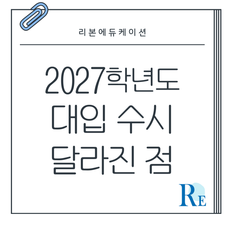 송도 입시 컨설팅의 중심, 리본에듀케이션입니다. 2027학년도 대학계획안 기준 수시 교과전형과 종합전형 달라진 점 정리했습니다^^ 고3 수험생 및 학부모님들은 이번 포스팅을 확인하시고 6월 최종 확정되는 모집요강을 통해 최종 전략을 수립하시기 바랍니다^^ 1. 수시 교과전형 2. 수시 종합전형 2027학년도 수시 교과와 학생부 종합전형 달라진 점 내용 상 중복은 "전형요소"입니다. 교과에서는 서류평가를 반영하고 학종에서는 면접배수를 늘리거나, 서류평가 전형을 추가했습니다. 이는 2028학년도 대입 개편 상, 5등급제 내신으로는 기존처럼 변별이 어렵기에 다른 필터조건 : 면접 배수 증가, 학생부 내용(=생기부 관리) ....... <img src="https://blogthumb.pstatic.net/MjAyNjA0MjFfOSAg/MDAxNzc2NzU5MTQ0MDY1.xOYfbQ9h3nGHt1btELfcCkuqqVtSoy88TCYmpbORLbQg.G1qztEs9Mk3zbVDp2hx7b_X8sSb_J-8Szecamj1_26og.PNG/%C1%A6%B8%F1%C0%BB-%C0%D4%B7%C2%C7%D8%C1%D6%BC%BC%BF%E4_-001.png?type=s3" />