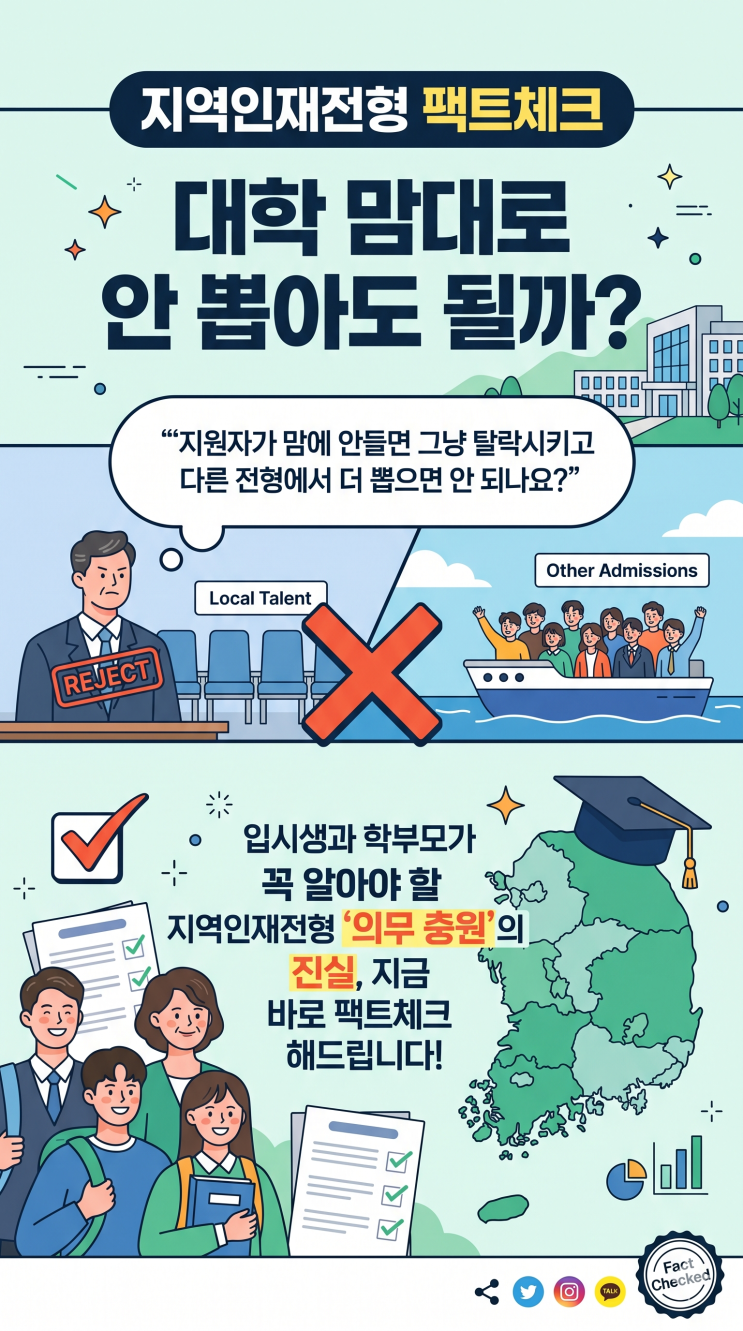 안녕하세요! 입시 고민을 시원하게 해결해 주는 입시 전문가 언니예요! ✨ 오늘은 우리 수험생들과 부모님들이 가장 불안해하는 주제, **"지역인재전형, 대학이 맘대로 안 뽑으면 어떡하지?"**라는 걱정을 팩트 폭격으로 싹~ 날려드리기 위해 왔어요! 독자님의 요청대로 **'가독성 200% 폭발하는 언니의 블로그 꿀팁'**을 듬뿍 담아서, 엔터 팡팡! 구분선 쫙쫙! 이모지 가득! 5,000자 이상의 아주 깊이 있는 정보를 준비했으니 천천히 따라오세요! 지역인재전형, 대학 맘대로 안 뽑고 누락시킬 수 있을까? "지원자가 맘에 안 들면 탈락?"... 입시 정글 속 '진짜 팩트'를 공개합니다! ✨....... <img src="https://blogthumb.pstatic.net/MjAyNjA0MTdfOTgg/MDAxNzc2Mzc3NTg4MDU3.ZEnC6WtWgexC_b4qo0bFns8IzuEjrpC4bb5VffQdV5wg.iBkDwcIIueDP-7SqaF6588gTTl26n9uB8hLyLLJiaXog.PNG/Gemini_Generated_Image_kcbtqokcbtqokcbt.png?type=s3" />