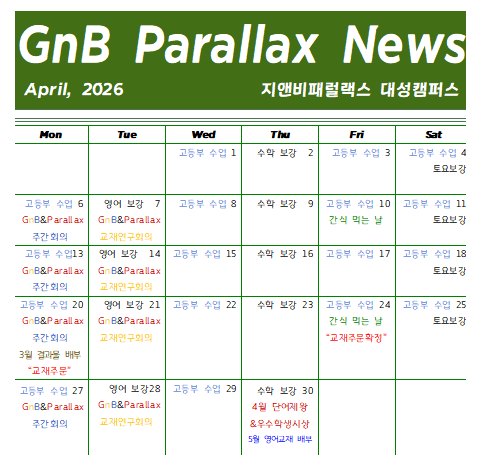 학부모님, 안녕하세요. 지앤비패럴랙스 대성캠퍼스입니다. 4월 학습 일정 및 소식입니다. 이번달은 중고등부 중간고사가 4월 23일부터 있어서 중고등부 보강이 주말에 잡혀있습니다. ⭐️5월 1일 학원 정상 운영합니다. 초등부 보강은 이번주부터 3주간 토요일 10시~11시 30분까지만 운영 예정입니다. 4월 20일에 3월에 학습했던 교재 결과물을 발송합니다. (학원 에코백이 집에 있다면 보내주셔요) 또한 매달 교재 주문도 20일에 합니다. 4월 30일에 4월 단어제왕 시험이 있습니다. 시상은 5월 1일에 합니다. <단어제왕 시상> 3000원(만점) <옥스퍼드1반>양0아, 송0온 <하버드1반>윤0호 2000원(최우수상) <옥....... <img src="https://blogthumb.pstatic.net/MjAyNjA0MDdfODgg/MDAxNzc1NTY1NDMyODg0.h55AwhbAvHhr5j073i9JlrngM8ITQ158PBBSXoynoekg.mo1pfh8SJJK7roL_pCpV8kraCEgC19GRPn0YsHOJJrsg.PNG/image.png?type=s3" />