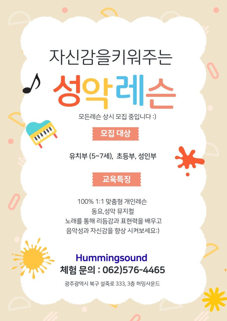 광주 유아 성악 / 우리 아이 첫 음악 수업, 5세 아이들은 언어 발달과 정서 함양에 노래만큼 좋은게 없죠 ! 광주 성악레슨 ! ‘노래하는 즐거움’ 5세부터 성인까지, 맞춤형 1:1 레슨 모집합니다 ! 우리 아이들의 예쁜 목소리와, 성인분들의 당당한 목소리를 찾아드리는 성악학원 허밍사운드 ! 입니다 :) “노래 부르는 걸 좋아하는데, 본격적으로 배워볼 수 있을까?” 고민하셨나요? 광주 성악학원 허밍사운드에서는 5세~ 성인 취미반까지 다양한 클래스로, 5세 ~ 초등학생 올바른 발성 성악 : (놀이처럼 즐거운 클래스) 올바른 발성 습관 : 어린 시절의 발성 습관이 평생의 목소리를 결정합니다. 자신감 Up : 동요와 쉬운 가곡을 통해 표현력을....... <img src="https://blogthumb.pstatic.net/MjAyNjA0MTVfMTc4/MDAxNzc2MjUxMjQ0NTY2.yXoDQigeG3p2Ogo_SFz7FvXRXNgaKr806aDjF__UFW8g.ycIo258cXzZwv43wW-TjzXPfOA56nfAivNkIhMMKRaQg.JPEG/%BA%A3%C0%CC%C1%F6%BB%F6_%B9%E8%B0%E6_%B9%CC%BC%FA_%BF%EB%C7%B0_%C0%CF%B7%AF%BD%BA%C6%AE_%BE%EE%B8%B0%C0%CC_%B9%CC%BC%FA%C7%D0%BF%F8_%C8%AB%BA%B8_%C6%F7%BD%BA%C5%CD.jpg?type=s3" />