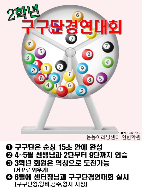 3월부터 시작된 구구단 외우기를 5월까지 완성합니다. 완성후 6월 1~12일까지 센터장님앞에서 무작위로 도전, 구구단왕,왕비,왕자,공주를 뽑아 시상합니다. 도전!! <img src="https://blogthumb.pstatic.net/MjAyNjA0MjFfMjI3/MDAxNzc2NzY2MzU1OTE3.fUodTk2cE84XxowTq_S77pc8LRECkLg6SC2FCschoEYg.HyyHDjgn1OY9RKyiMZ4Nt7NnajqvK42Gn-qUwknnp3Ag.PNG/%B1%B8%B1%B8%B4%DC%B0%E6%BF%AC%B4%EB%C8%B8.PNG?type=s3" />