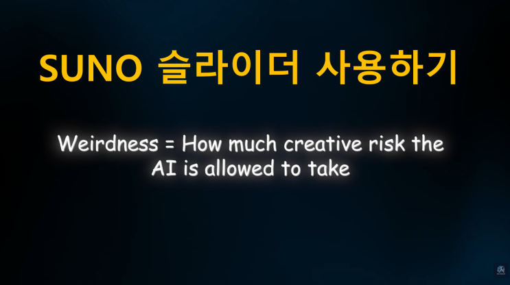 How to Master Suno’s Advanced Sliders (Pro Settings) 이 영상은 Suno AI에서 음악을 생성할 때 결과물을 더욱 정교하게 제어할 수 있도록 돕는 세 가지 고급 설정인 Weirdness(엉뚱함), Style Influence(스타일 영향력), Audio Influence(오디오 영향력) 슬라이더에 대해 상세히 설명합니다. https://youtu.be/5tYSx_5c3Us?si=GU6KHv_IgnxIms-w 주요 슬라이더 기능: Weirdness (0:48 - 4:54): AI가 얼마나 창의적이고 실험적인 시도를 할지 결정합니다. 낮은 값(0%): AI가 표준적인 음악 규칙을 엄격히 따르며 예측 가능한 결과를 생성합니다(2:06). 중간 값(50%): 구조를 유지하면서도 자연스럽고 독창적인 변주를 추가합니다(3:13). 높....... <img src="https://blogthumb.pstatic.net/MjAyNjA0MTNfMTY3/MDAxNzc2MDcxNDU5MDk5.WHBJsIiTjWyW3WYl0yeT5XVx9Oo9Xtje17smo3KjDvQg.xzKgsMkndPUG9Mk1FwJy6nI2fr6Rnoc_P6GS5IVm_mkg.PNG/20260413_175924.png?type=s3" />