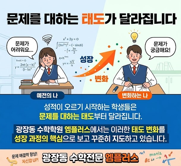 안녕하세요. 광장동수학학원 엠플러스입니다✨ 수학 성적은 어느 날 갑자기 오르지 않습니다. 시험 점수로 확인되기 전, 이미 아이의 학습 과정에서는 작은 변화들이 먼저 나타나기 시작합니다. 하지만 많은 경우 이 변화를 놓치고 점수만으로 판단하게 됩니다. 그래서 성적이 오르기 전 단계에서 어떤 변화가 나타나는지 미리 확인하는 것이 중요합니다. 광장동수학학원 엠플러스에서도 성적이 꾸준히 상승하는 학생들을 보면 시험 결과보다 먼저 공통된 변화가 나타나는 것을 확인할 수 있습니다. 문제를 대하는 태도가 달라집니다 성적이 오르기 시작하는 학생들은 문제를 대하는 태도부터 달라집니다. 문제를 대충 읽지 않고 끝까지 확인하며....... <img src="https://blogthumb.pstatic.net/MjAyNjA0MjNfMjU2/MDAxNzc2OTE5NzQwMzg3.4kZQK3nqP11QcoXDE5kUE4Ea8nZzNAGcDcMC06FVGckg.d39ms12ngBoBnMgjGok-BRFWb0FYWQIzDxALJZS5B40g.JPEG/db138b8a-c5a1-4b8d-abd4-a70672c8ec20.jPG?type=s3" />
