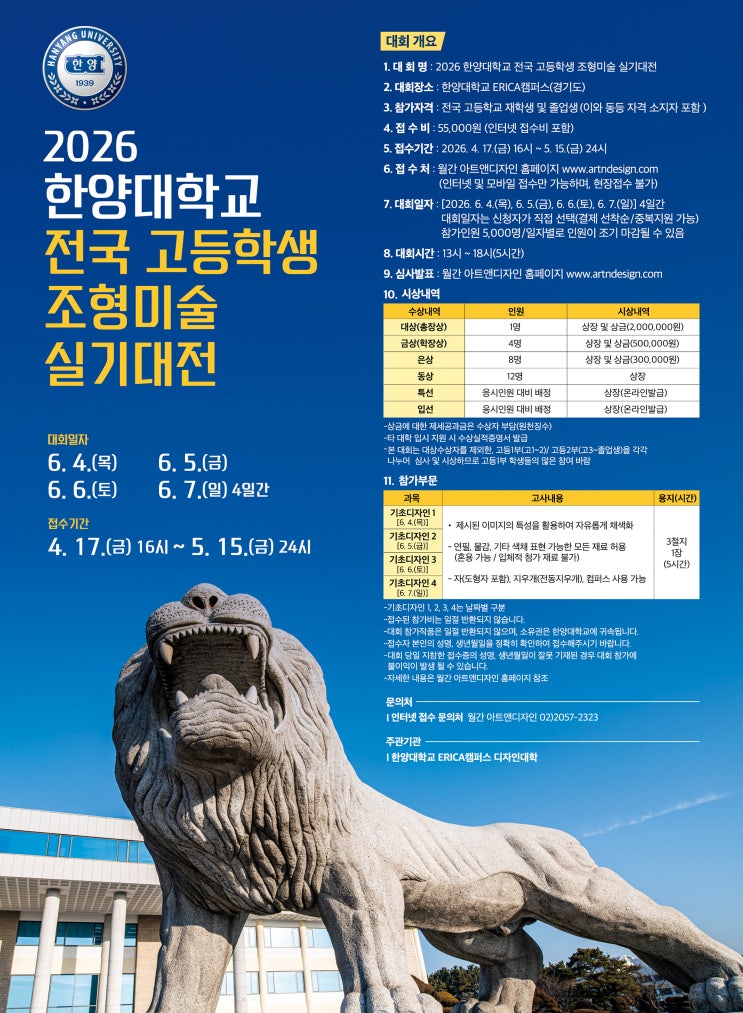안녕하세요. 아트그로우미술학원 입니다. 이제 제법 날씨가 따뜻해진 것 같습니다. 그래도 아직은 오전에는 살짝 쌀쌀한 기운이 있으니~ 일교차가 큰 만큼 모두 감기 유의하시기 바랍니다!! 오늘 전해드릴 소식은 2025년 한양대 실기대회 소식입니다.^^ ▶주최 : 한양대학교 ERICA 캠퍼스 ▶ 일시 : 2026년 6월 4일(목) ~ 2025년 6월7일(일) 4일간 ※ 시험은 오후 1시부터 시작됩니다. ※ 고사장 입실은 11시 40분부터 가능합니다. ※ 참가자는 대회일시 30분전까지 입실합니다.(지각자 입실불가) ※ 주제어는 4월 중 확정 공지 예정. ▶ 고사장소 : 한양대학교 ERICA 캠퍼스 ▶ 수상자발표 : 아트앤디자인 홈페이지(발표/발표일미정) ▶ 참가자....... <img src="https://blogthumb.pstatic.net/MjAyNjA0MTNfNjgg/MDAxNzc2MDU0ODQ0MjQ5.gGQvN_81jj2W1quwd1UwASfPVT7bUQvSXzxZKaUmFHEg.1SjbWNJoblS2qXQoxcIjTN3Ye272JU6KNF5fqIDQXTYg.JPEG/poster.jpg?type=s3" />