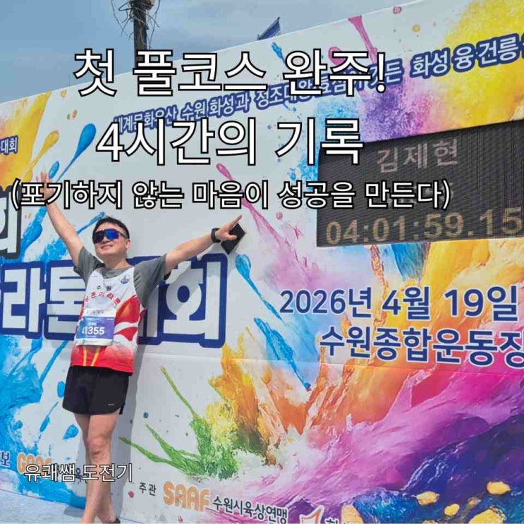 [경기마라톤] 첫 풀코스 완주! 42.195km의 도전, 포기하지 않는 마음이 만든 기적 안녕하세요! 유쾌한 수학과학의 유쾌쌤입니다. ^^ 지난 4월 19일, 저는 제24회 경기마라톤 대회에 참가해 생애 첫 '풀코스(42.195km)' 완주라는 뜻깊은 기록을 세우고 왔습니다. ■ 연습은 배신하지 않는다: 4시간의 사투를 준비하며 대회 한 달 전부터 매주 일요일 새벽 5시, 남들이 잠든 시간부터 거리를 늘려가며 연습했습니다. 33km, 35km... 한계를 시험하며 준비했고, 대회 직전 주에는 20km로 컨디션을 조절하며 만반의 준비를 마쳤습니다. ■ 예상치 못한 복병, 그리고 완주의 기쁨 하지만 실전은 쉽지 않았습니다. 갑자기 더워진 날씨와 원활....... <img src="https://blogthumb.pstatic.net/MjAyNjA0MjFfMTQ4/MDAxNzc2NzU0Mzc4ODE3.Dy9eOWehq-zKcICC5hFz_5tBeXJBeDPMV0DsMcXrgCcg.XfakPTp4gj3ZkuiDZwPxtSmcnO3WEPfjJRos8slZsn8g.JPEG/1.jpg?type=s3" />