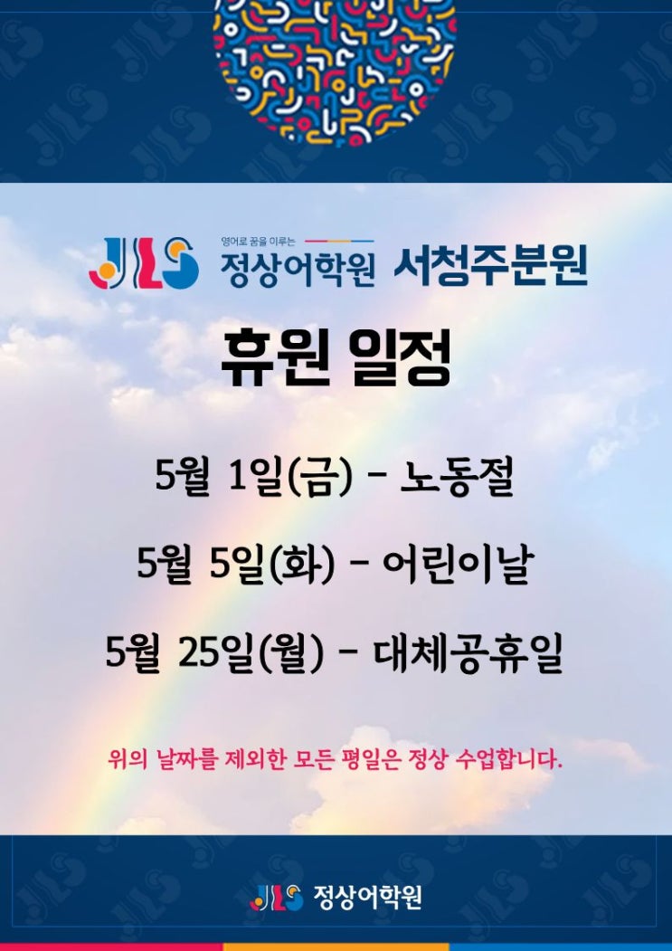 [서청주 정상어학원][복대동 지웰시티 영어학원] 26년 5월 휴원 안내