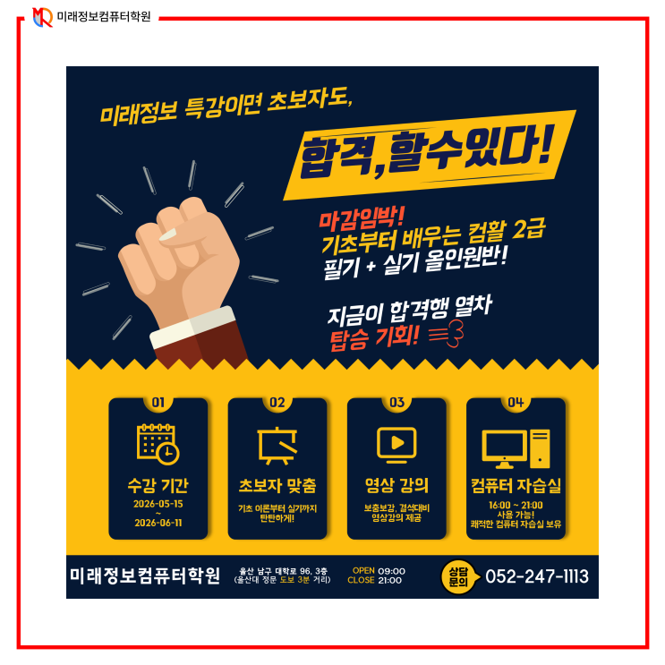 안녕하세요! 미래정보컴퓨터학원입니다. ☺️ 벌써 5월이 코앞으로 다가왔네요! 5월 초에는 어린이날부터 어버이날까지 긴 연휴가 이어지죠? 푹 쉬고 즐거운 시간을 보내는것도 중요하지만, 긴 연휴가 끝나고 나면 일상으로 돌아가기 꽤 힘들잖아요 아, 이제 진짜 뭐라도 해야겠다! 싶은 그 마음, 저희 미래정보가 꽉 잡아드릴게요. 연휴 끝나고 마음 다잡기 딱 좋은 5월 15일 개강반을 소개합니다! 왜 미래정보일까요? 자격증 공부, 혼자 하면 작심삼일이기 쉽죠. 저희 학원의 장점을 확인해 보세요! 1. 결석해도 걱정 NO! 수업 영상 강의 제공 혹시 급한 사정으로 수업을 빠지게 되더라도 걱정 마세요. 복습용 및 결석자 대비 수업 영....... <img src="https://blogthumb.pstatic.net/MjAyNjA0MTdfMjQ3/MDAxNzc2Mzg3OTI1NTM4.TAMLuvotmR8Ci0-tmPkDQ74YkW4VEXwKQWzQGSX3w1Yg.P6V-P8c_-KI01nE_pCGp8vffzzLrKhYnwpb9HUCcjTUg.PNG/1-2471113.png?type=s3" />