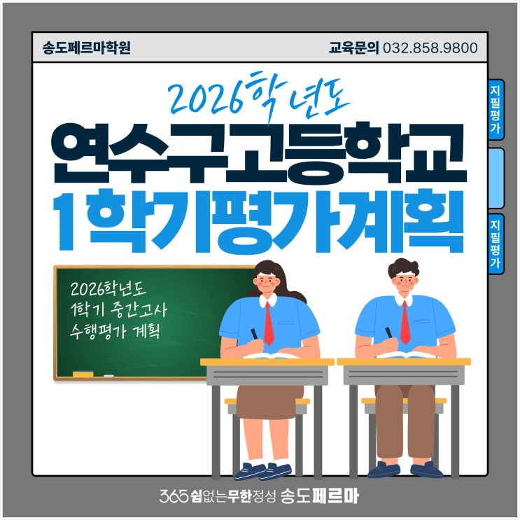 연수구 지역 고등학교들의 올해 첫 지필고사인 2026학년도 1학기 중간고사가 이르게는 모레부터 시작되어 오는 4월 30일경 모두 마무리됩니다. 이와 함께 올해 1학기 학교별 평가계획이 발표되면서, 중간고사 이후 수행평가를 포함한 학생들의 내신 준비 방향도 더욱 구체적으로 설정해야 할 시점입니다. 송도 수학페르마학원에서는 이번 평가계획을 단순히 확인하는 수준을 넘어, 실제 지도에 반영할 수 있도록 학교별 자료를 구해 세밀하게 분석하였습니다. 2026학년도 1학기 연수구지역 고등학교들의 평가계획을 살펴보면, 지필평가와 수행평가의 비율은 여전히 학교마다 차이를 보이지만, 전반적으로 수행평가의 비중이 점점 높아지고 있는 흐....... <img src="https://blogthumb.pstatic.net/MjAyNjA0MjNfNDIg/MDAxNzc2OTMyNjM2NzQ0.DH4KUecC6wngFi1-fzYUSpwIVzQGm6NO9LOiPcs1sOkg.Fe-vY-Xo5dK1SGqg_TkCnpNy3sPgObc9XDuaQ1f08jUg.JPEG/%BC%DB%B5%B5%BC%F6%C7%D0%C7%D0%BF%F8.jpg?type=s3" />