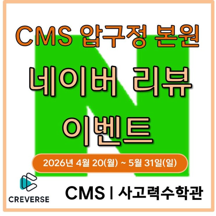 안녕하세요~ 압구정쌤입니다 봄학기에 이어 여름학기에도 네이버 리뷰 이벤트를 진행합니다! 테스트 응시 후 수강 등록(또는 재수강 등록)하신 학부모님 중 네이버 리뷰를 작성해 주신 분들께 커피 쿠폰을 보내드립니다 ☕ ✔ 방법 1 (신규생) 1. 네이버에서 ‘CMS압구정’ 검색 후 테스트 예약 2. 테스트 결과 상담 후 등록 3. 예약 완료 알림에서 ‘리뷰 쓰러가기’ 클릭 후 리뷰 작성 4. 현장 데스크에서 리뷰 확인 후 커피 쿠폰 전송 ※ 네이버 알림을 못 받으신 경우 네이버 앱 하단 마이 → 예약 → 예약내역에서 확인하실 수 있습니다. ✔ 방법 2 (신규생 / 재원생) 1. 수강료 현장 결제 후 영수증 출력 필수 2. 데스크에 비치된 안....... <img src="https://blogthumb.pstatic.net/MjAyNjA0MTdfMjIx/MDAxNzc2Mzk5MzkzODcz.s-c7Tf78TAaxjiUZr4PDKP35_8xQ4JQGtFq3NN0pzzog.TU1VrIso_Xmpiz-NZmu9Aa2W5WXeQBLaQuwlsmPm5kog.JPEG/%B3%D7%C0%CC%B9%F6_%B8%AE%BA%E4_%C0%CC%BA%A5%C6%AE_%BA%ED%B7%CE%B1%D7_%B8%DE%C0%CE.jpg?type=s3" />