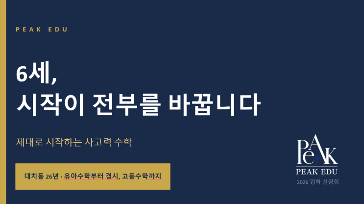 2026년 피크 6세반 시작합니다. 안녕하세요~ 일프로샘입니다^^ 오늘은 오랫만에 피크에듀본원에서 입학설명회를 진행했어요. 간결하게 피크의 교육관을 전달 하고싶어서 내용도 정돈하고 슬라이드 수도 평소보다 대폭 줄였는데도 딱 1시간을 이야기했네요 ㅎㅎㅎ 오늘 설명회에 참석해주신 미모의 어머님들~ 진심으로 반가웠습니다. 하얀 캔버스인 우리 6세 친구들이 공부할 때 챙겨야 할 것들!! 그리고 기준들을 고민해보는 계기가 된 시간이었기를 바래봅니다. 오늘 참석자 선물로 나누어드린 필즈 첫 입학 모의고사도 잘 두셨다가 꼭 연말 시험전에 꺼내서 활용해주세요 ^^ 피크에서 함께한다면 더더욱 행복할 것 같아요~ 장소 관계상 아....... <img src="https://blogthumb.pstatic.net/MjAyNjA0MjBfMTc3/MDAxNzc2Njc3NzM5NjYz.y2XwFWIb_wBKpVflAKWkAbg0hzMigWv_WWUDMCRraeAg.eHqm5ZcU6fflUmBhDJRsEg7dIthLrWiHJgq0Kd3Yn9Mg.PNG/image.png?type=s3" />