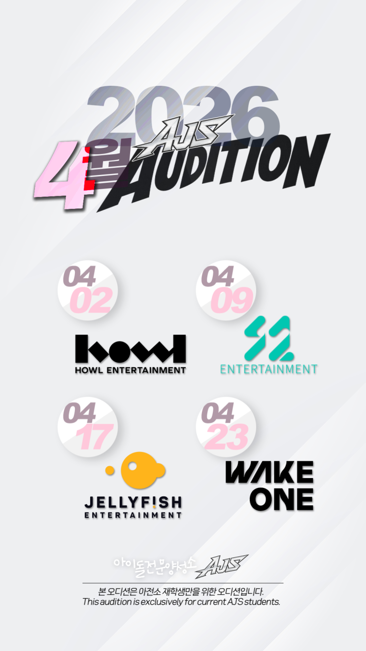 AJS 아이돌전문양성소 2026년 4월 내방오디션 하울/S2/젤리피쉬/웨이크원