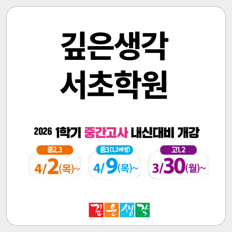 2026 1학기 중간고사 내신대비 개강 안내 | 깊은생각 서초학원 2026년 1학기 중간고사 대비반 개강! 지금 바로 시작하세요 안녕하세요, 깊은생각 서초학원입니다. 2026년 1학기 중간고사 시즌이 다가오고 있습니다. 시험 준비, 지금 시작하지 않으면 늦습니다! 깊은생각 서초학원에서는 학년별 맞춤 내신대비 특강반을 개강합니다. 입학 전 입학테스트 예약도 가능하니, 아이 수준에 딱 맞는 반 배정을 받아보세요. ️ 학년별 개강일 안내 ✅ 깊은생각 서초학원 내신대비반, 이런 학생에게 추천합니다 중간고사를 앞두고 체계적인 커리큘럼으로 준비하고 싶은 학생 학교 수업만으로 부족함을 느끼는 중2, 중3, 고1, 고2 학생 자신의 수....... <img src="https://blogthumb.pstatic.net/MjAyNjA0MDhfOTMg/MDAxNzc1NjIwNDU5NTM5.frFIeHRsS5pG1miu2Hjv0Q--JKZfHbFN3fZOxwSNoM4g.WW7CvpPxQ3SAEca5y9bX_i9rJd7h7LErTXdKWfKqfLog.PNG/%C1%A6%B8%F1%C0%BB_%C0%D4%B7%C2%C7%D8%C1%D6%BC%BC%BF%E4._%2817%29.png?type=s3" />