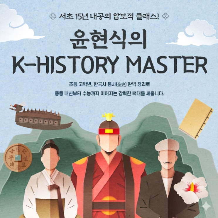 우리 아이들이 중학교 진학을 앞두고 가장 부담스러워하는 과목 중 하나가 바로 '한국사'입니다. 방대한 분량 때문에 암기 과목으로만 접근하면 금방 지치고 흥미를 잃기 쉽죠. 하지만 초등 고학년 시기에 한국사의 흐름을 '통사(全史)'로 꿰뚫어 보는 안목을 기른다면, 이는 중등 내신은 물론 수능까지 이어지는 가장 강력한 무기가 됩니다. 그래서 준비했습니다! 서초점 15년 내공의 압도적 클래스, 윤현식 선생님의 가 오는 5월, 12주 과정으로 여러분을 찾아옵니다. 왜 지금 통사를 끝내야 할까요? 초등학교 때 파편적으로 배운 역사 지식은 금방 휘발되기 마련입니다. 본격적인 중등 역....... <img src="https://blogthumb.pstatic.net/MjAyNjA0MThfMjIg/MDAxNzc2NDk2NjQ5Mjc2.m5noC7Pi60LC3_j5ngVk9tFMU2Rq1ljyA0--UkNx7Ewg.cXkWFm1qm1SK48b6zjU96nOi5u39EKMYwlA4WU-U0HYg.PNG/KakaoTalk_20260418_161630004.png?type=s3" />