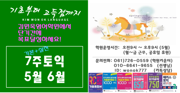 안녕하세요^^ 순천토익학원 김원옥영어학원입니다. 따스한 날씨때문인지, 날리는 꽃잎 때문인지 공부에 집중할수 없는 요즘입니다 ^^ (결석이 많ㅎㅎㅎ) 하지만 이런 유혹에 넘어가 세워둔 계획을 뒤로 미룬다면, 분명 즐거웠던 오늘을 후회하게 될꺼에요. (제가 그래요. 제가ㅠㅠ) 기회가 왔을 때 잡으려면 미리 미리 준비해야겠죠^^ 자! 다시 굳은 각오로 열심히 공부합시다!!! 토익특강 기간: 2026년 5월6일 ~ 6월24일 (7주) 2026년 5월28일 ~ 6월24일 (4주) ------------------------------------------------------------------------------------------------------------------------------------------ *7주토익반 (오전,오후)* 7주과정....... <img src="https://blogthumb.pstatic.net/MjAyNjA0MDZfMjcy/MDAxNzc1NDM2MDMxOTIw.c6QW6LzLxSthzMA-FRV-64c0BTrmOuVRpDpOBO0mIhUg.i1yn5WRR2XPA9fEhE0lacJfW5R6MDBowkx9v-VxkAoEg.PNG/2026%B3%E25%BF%F96%BF%F9%C5%E4%C0%CD%B4%EB%B9%AE.png?type=s3" />