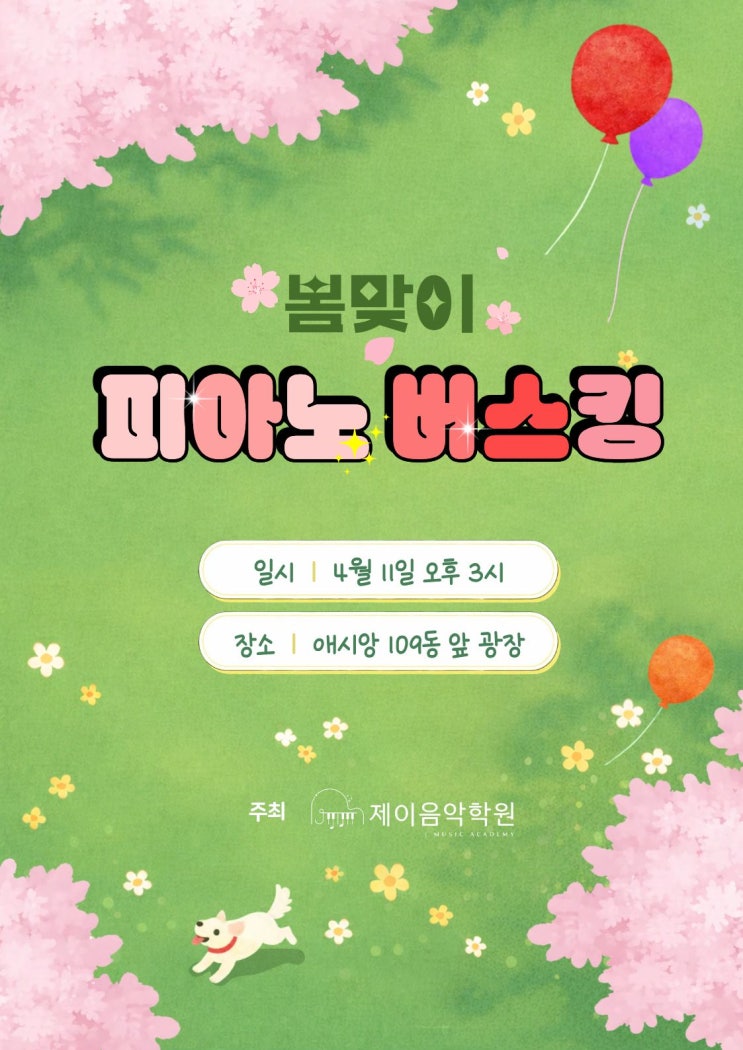 올 봄, 아이들과 함께 준비한 작은 무대를 소개합니다 제이 음악학원에서 ‘봄맞이 피아노 버스킹’을 진행합니다! 아이들이 그동안 열심히 연습해온 곡들을 조금 더 특별한 공간에서, 조금 더 많은 사람들 앞에서 직접 들려드릴 수 있는 시간을 만들고 싶어서 기획하게 되었어요. 이번 버스킹은 단순한 연주 발표가 아니라 아이들이 ‘연주하는 즐거움’을 제대로 느낄 수 있는 자리예요. 긴장도 하겠지만, 그만큼 성장하는 순간이 될 거라 믿어요 :) 이번 공연은 총 2부로 나누어 진행됩니다. ✔ 1부 – Solo 각자 혼자서 무대를 채우는 시간이에요. 처음 무대에 서는 친구들도 있고, 조금 더 여유롭게 표현하려는 친구들도 있어요. 클래....... <img src="https://blogthumb.pstatic.net/MjAyNjA0MDhfMTgg/MDAxNzc1NjQzNTg5NTA5.10rq9yzb9MbaCE2cuS3ZLuTkMi7H2FSGaKW6UYIX_UEg.zg2KnkowbHjHFBuZClQa0s-E8bt0nnQ3u8CsVHuhNycg.JPEG/%C1%A6%B8%F1%C0%BB_%C0%D4%B7%C2%C7%D8%C1%D6%BC%BC%BF%E4..jpg?type=s3" />