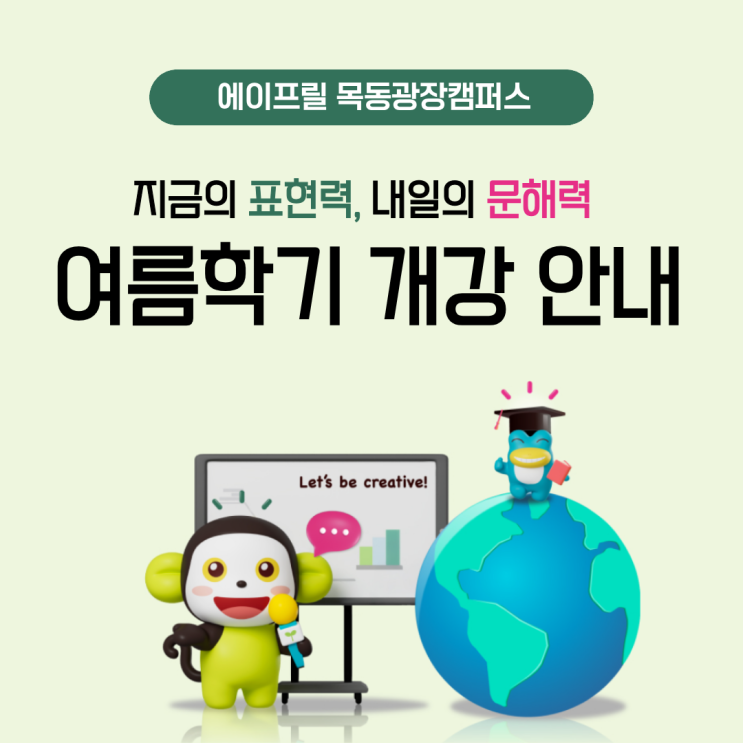 학부모님 안녕하세요 에이프릴 목동광장캠퍼스입니다! 다가오는 6월부터는 에이프릴의 여름학기가 시작됩니다. 여름학기 개강을 맞이하여 학부모 설명회 / 신규 입학 프로모션이 진행되니 학부모님들의 많은 관심 부탁드립니다! 에이프릴어학원에서는 레벨별 최적화 프로그램을 바탕으로 영어의 네 가지 영역 수업을 모두 진행합니다. 여름학기 개강 프로모션 학부모 대상 입학설명회 안내 여름학기 개강을 맞이하여 에이프릴을 다니지 않는 비재원생 학부모님 대상 입학 설명회가 개최됩니다. 5월 매 주 토요일마다 입학 설명회가 있을 예정이니 학부모님들의 많은 신청 부탁드립니다^^ 자세한 내용은 아래의 게시글 참고 부탁드립니다. ▼ 입학....... <img src="https://blogthumb.pstatic.net/MjAyNjA0MjFfMTcg/MDAxNzc2NzU0OTI1NDI5.xp5jYXapLSnvlOCFzU7lQftEb8swxxfobzX6q100QCog.wlTlHb7gkKNdnwayo9kHcxZ3KVMr6CrxrKeaOnFxT8og.PNG/%C1%A6%B8%F1%C0%BB_%C0%D4%B7%C2%C7%D8%C1%D6%BC%BC%BF%E4..png?type=s3" />
