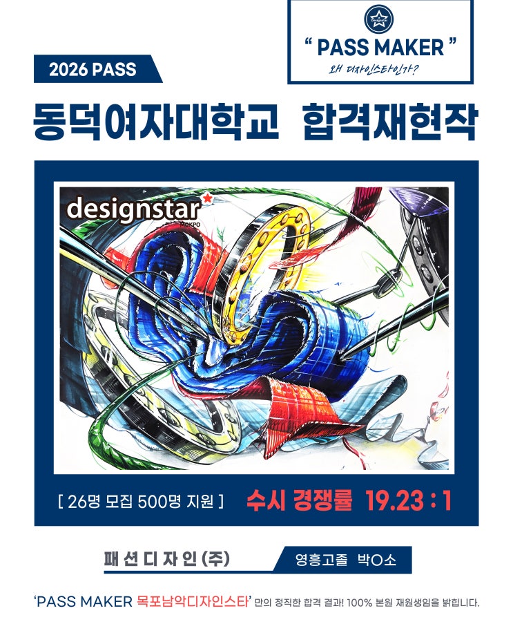 안녕하세요! 목포 남악 '디자인 미대입시 전문' 디자인스타미술학원 입니다! 오늘 포스팅할 내용은 '동덕여자대학교'에 합격한 학생의 재현작 입니다. 19.23:1의 경쟁률을 뚫고 최초 합격한 그림입니다. 합격 재현작을 보면 말하고자 하는 주제에 대한 연출 해석과 시선 유도가 자연스럽고도 강인하게 평가자에게 한 번에 전달됨을 알 수 있습니다. 모든 기초디자인은 정확한 물성과 문제에서 요구하는 주제 해석 능력이 필요합니다. 위 그림의 경우 '500명'과의 경쟁에서 최초로 합격했으니 그 실력이 정말 대단합니다. 다시 한번 동덕여대에 합격한 박 O 소 학생 진심으로 축하합니다! 목포 남악 디자인스타에서....... <img src="https://blogthumb.pstatic.net/MjAyNjA0MTVfNTkg/MDAxNzc2MjQ5ODk3MDAw.p2N6JlBzSMbPEDNEgZssMXoTJtGuSxl1uxZyBmtRLoEg.A7_eWoB7ZL7tZASuxViqRMzO92FY0dVS3p6n1SKL07cg.JPEG/3.%B9%DA%B9%CC%BC%D2_%B5%BF%B4%F6%BF%A9%B4%EB.jpg?type=s3" />
