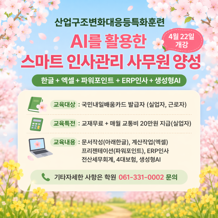 5월 국민내일배움카드 및 일반교육생 모집합니다. 학원상담문위 : 061-331-0002 ( 산대특과정은 실업자에게 훈련수당이 최대 매월20만원 지급됩니다. ) <img src="https://blogthumb.pstatic.net/MjAyNjA0MjBfMTkg/MDAxNzc2NjQwMzU3ODY3._UHP-iTUZdtZVN_mn2QW2Y981rk5oVFyWuX3HGDZsnUg.2pfVDr9BqCt_03P8Go2YTjMnfagG0phoaQSvl6Q20bgg.PNG/ERP%C0%CE%BB%E7.png?type=s3" />