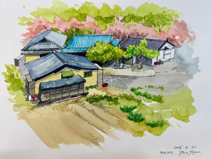 이곳은 아침 일찍 문을 여는 카페라, 아들을 학교에 데려다준 뒤 바로 출발할 수 있었다. 덕분에 오전 9시쯤 도착해 여유롭게 주변 풍경을 둘러보고, 두 작품을 완성할 수 있었다. 일찍 오픈하는 카페는 시간을 넉넉하게 쓸 수 있어 그림을 그리기에 더욱 좋다. 카페 바깥 풍경은 참 평화로웠다. 외곽에 위치해 있어서인지 공기도 한결 맑고, 전체적인 분위기도 여유롭다. 근처에 복숭아밭이 있어 꽃이 피어 있기를 기대했지만, 아쉽게도 관리가 되어 있지 않아 꽃을 볼 수는 없었다. 그래도 대신 싱그러운 초록빛 풍경을 마음껏 담을 수 있어 만족스러운 시간이었다. #어반스케치 #어반스케쳐스대구 #수요드로잉 #사월동카페 #캐빈커피 #야외스....... <img src="https://blogthumb.pstatic.net/MjAyNjA0MjVfMjEw/MDAxNzc3MDc0OTIzNTM2._cVYbNrrC29i6kdsTeYAmeBpz2tPk904Z-dzmLAdxGIg.rqS3HtEp2RZFXpqUZWPRjlSJN6j2tahfTQ00km5Fe7Yg.JPEG/IMG%A3%DF0948.jpg?type=s3" />