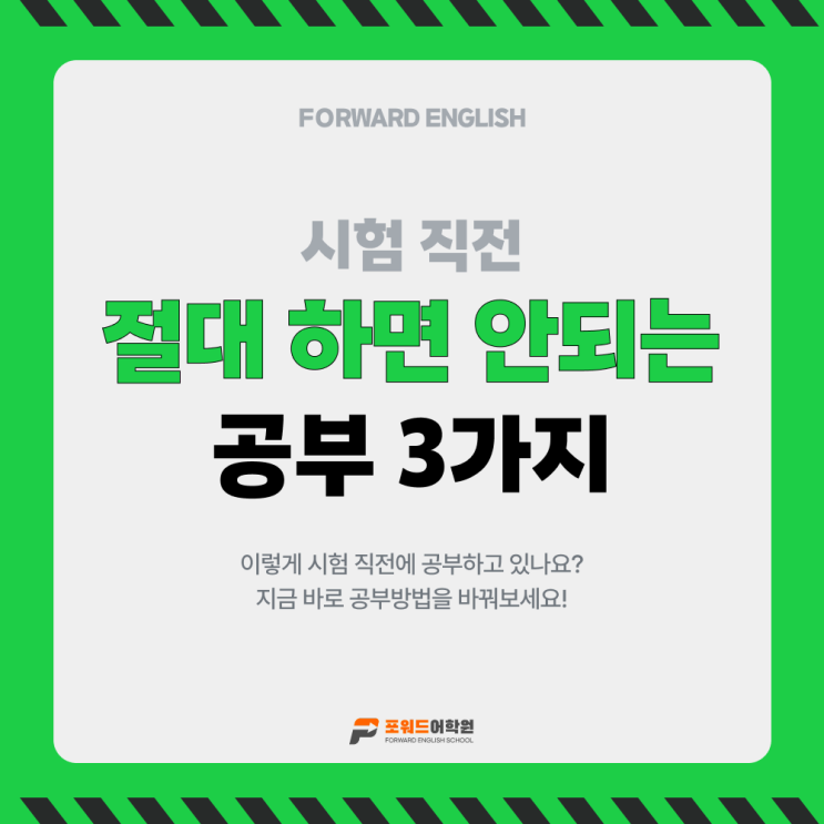 안녕하세요, 포워드어학원입니다. 시험이 가까워질수록 학생들이 공부하는 양은 늘어나는데 방향을 놓칠때가 있습니다. 그래서 이번 포스팅에서는 시험 직전에 하면 오히려 성적을 떨어뜨리는 공부 방법 3가지를 정리해보려고 합니다. 시험 직전이 가장 중요한 기준 이 시기의 공부는 "새로 배우는 시간”이 아니라 “이미 아는 것을 안정시키는 시간"입니다 이 기준이 흔들리면 공부를 많이 해도 성과가 나오지 않습니다. ❌새로운 내용을 시작하는 공부 시험 직전에 새로운 문법, 새로운 지문, 새로운 문제를 풀기 시작하는 경우가 있습니다. 하지만 이 시기에 새로운 내용을 넣으면 ✔ 기존에 알던 내용까지 흔들리고 ✔....... <img src="https://blogthumb.pstatic.net/MjAyNjA0MjNfNzIg/MDAxNzc2OTM3MDU1MDU1.BAY967sm8tYls8AQBOoQQSROoZqLhwXFNJ6f1574lZ4g.1_3fEfW1bUmBeBsrJZ27iaAkMasyepkGt8DMNUKed6og.PNG/Instagram_post_-_73.png?type=s3" />