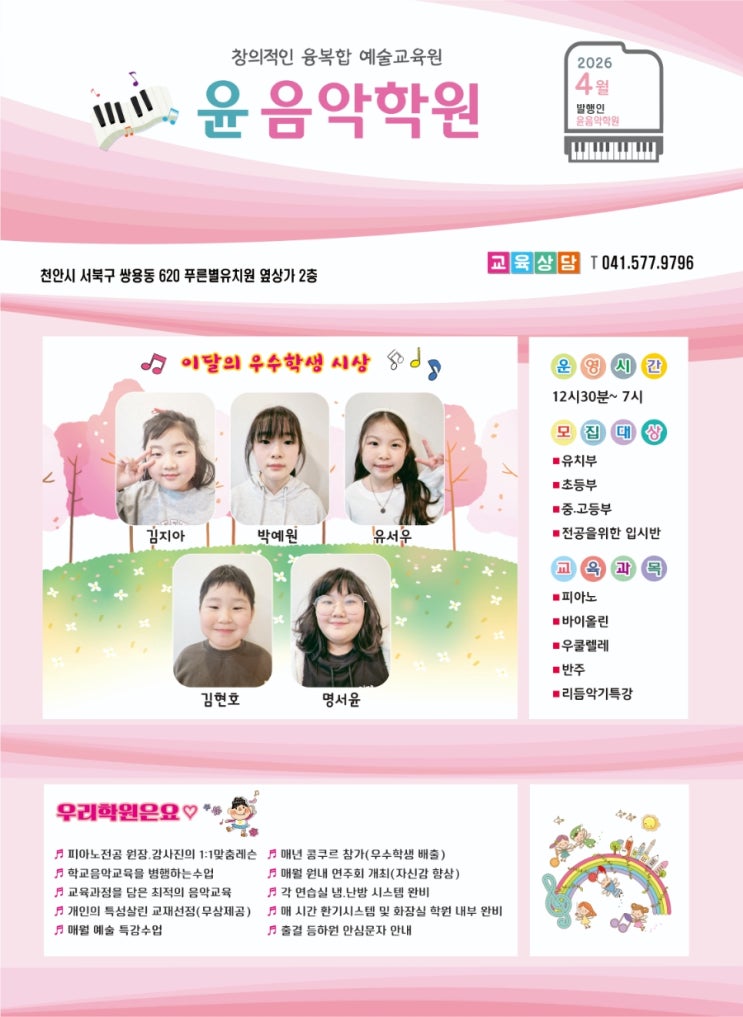 #윤음악학원#쌍용동 음악#쌍용동 음악학원#천안 음악학원#쌍용초등학교#쌍용초 피아노#쌍용초 음악#쌍용초 피아노학원#쌍용동 윤음악학원#천안 피아노#천안 콩쿠르#쌍용병설 유치원#푸른별 유치원#쌍용동 능수어린이집#천안 학원#쌍용동 학원#천안 음악전문학원#쌍용동 한라동백아파트#쌍용동 일성능수 아파트#쌍용동 모란아파트#윤음악#쌍용동 피아노#쌍용동 피아노학원#쌍용초 피아노학원#미라초 음악학원#쌍정초 음악학원#수곡초 음악학원#쌍용초 유치원음악학원#쌍용동 초등음악#쌍용동 입시음악 안녕하세요 ^-^ 윤음악학원 4월 우수학생 시상식을 하였습니다.♪ 유서우(쌍용초) 김지아(쌍용초) 박예원(쌍용초) 김현호(월봉초) 명서윤(쌍용초....... <img src="https://blogthumb.pstatic.net/MjAyNjA0MTRfMjkw/MDAxNzc2MTQyMzcwMDQ4.zloKqT5ccRegBexoa2PGWNzoWM8L5BpSE17-2zUiXDog.Pdh2RzsjVJ8fHgad1a_CEI0Ps-oGdLip9VIaWNx5Hfcg.JPEG/900_1776142221425.jpg?type=s3" />