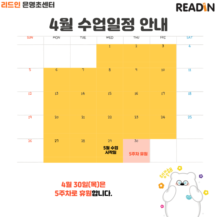 안녕하세요, 리드인 은명초센터 입니다. 따뜻한 봄기운이 완연해진 4월입니다. 새로운 계절과 함께 아이들이 더욱 즐겁고 알차게 성장할 수 있도록 최선을 다하고 있습니다. 4월을 맞아 수업 일정과 관련된 전달사항을 안내드리오니, 학부모님들의 참고 부탁드립니다. 수업 일정 안내 4월 30일 (목) 5주차 휴원 5월 1일 (금) 근로자의 날 휴원 5월 27일 (수) 6월 3일 선거일 대체수업 일정에 착오 없으시도록 꼭 확인 부탁드리며, 변동 사항이 있을 경우 사전에 다시 안내드리겠습니다. 항상 학원을 믿고 보내주시는 학부모님들께 감사드리며, 아이들이 꾸준히 성장할 수 있도록 더욱 세심하게 지도하겠습니다. 감사합니다 <img src="https://blogthumb.pstatic.net/MjAyNjA0MTVfMjY3/MDAxNzc2MjQzNDExNTg5.a6a6FSvEN8iVxTmvxEUBLxXf3_OWRjlhoXBDt6NNH4Ig.hLMwKreRTsvGMcQiZKPEwtomnZtUOgNcMXKltk3ySEMg.PNG/4%BF%F9.png?type=s3" />