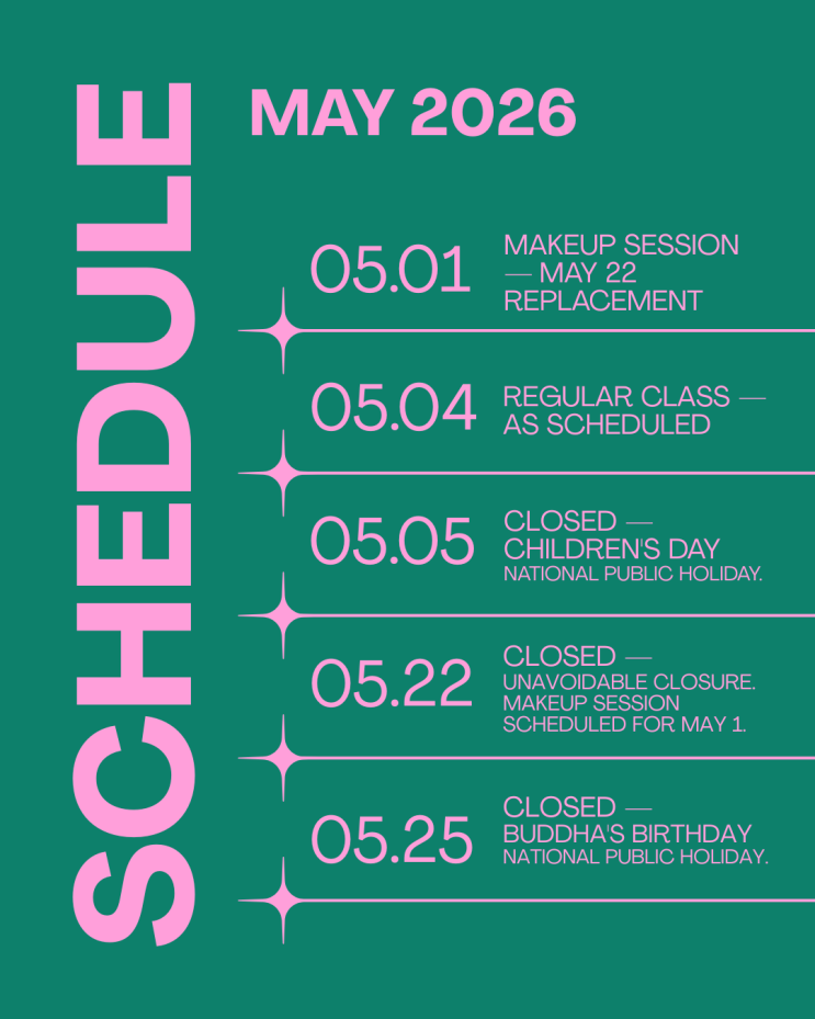 안녕하세요? 캠퍼 잉글리쉬입니다. 5월 주요 일정을 안내드립니다. 5월은 공휴일이 다수 포함되어 있어 수업 일정에 변동 사항이 있습니다. 또한 원장 개인 사정으로 인한 휴강 및 이에 따른 보강 일정도 함께 안내드리오니, 내용을 끝까지 꼼꼼히 확인하시어 일정 착오가 없으시길 바랍니다. 1. 공휴일 정규 휴강 안내 아래 날짜는 공휴일에 따른 정규 휴강일입니다. 해당 날짜에는 수업이 진행되지 않습니다. • 5월 5일 (화) — 어린이날 | 법정공휴일 휴강 • 5월 25일 (월) — 부처님오신날 | 법정공휴일 휴강 2. 원장 개인 사정에 의한 휴강 — 5월 22일 (금) 5월 22일(금)은 원장 수술 일정으로 인해 불가피하게 휴강하게 되었습니다. 학....... <img src="https://blogthumb.pstatic.net/MjAyNjA0MTVfMTEz/MDAxNzc2MjM0NTUwNTY5.B5_r3MjHTqnRDnDs5KKv090L0p7JcgboZ_xV8BIIzRYg.XbR6ZefDMG1TksDkqFM0KEJRhXkdijWkKtK4GVs7Svwg.PNG/Pink_and_Green_Typographic_Weekly_Schedule_Instagram_Post.png?type=s3" />