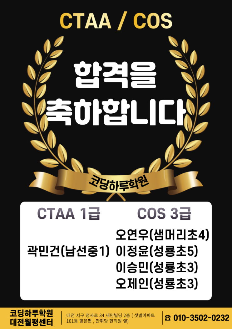 안녕하세요. 코딩하루학원 대전월평센터입니다. 이번 달에도 코딩하루학원에서 자격증 취득 소식이 이어지고 있어요 ! 아이들은 문제를 풀어가기 앞서 문제를 정확하게 읽고 조건을 이해하는 과정부터 차근 차근 연습했고 정답을 맞추는 것 보다 왜 그렇게 풀어야 하는지를 스스로 설명할 수 있도록 교육하고 있습니다. 이러한 과정이 쌓이면서 자연스럽게 자격증 취득도 이어지고 있습니다. 코딩하루학원은 결과를 위한 수업이 아니라 과정을 통해 결과가 따라오는 수업을 목표로 하고 있습니다. 아이들의 성장을 함께 응원해주신 학부모님들께 감사드립니다. 앞으로도 아이들의 사고 과정이 더 깊어질 수 있도록 수업을 이어....... <img src="https://blogthumb.pstatic.net/MjAyNjA0MTRfNzMg/MDAxNzc2MTUyODc4NTUy.ruDA6ZLDNEFZjZ4KDQFBRjXXoyRjJk8ggVTzjJm-j_wg.YXwR8Mg9hNWqTs1sVwLoFqt-jWeWHMfJBBagn46VNzEg.PNG/%C0%DA%B0%DD%C1%F5%C7%D5%B0%DD-001_%282%29.png?type=s3" />