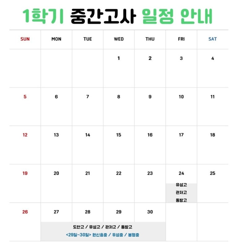 [공감수학학원] 각 학교별 중간고사 일정 안내 입니다.