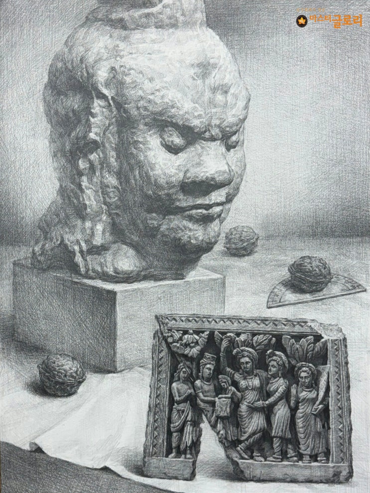 안녕하세요~ 홍대미술학원 마스터글로리 미술학원입니다! 오늘은 조금 특이한 전형중 하나인, 불교미술 재현작을 들고 와봤는데요! 불교미술 전형은 정물소묘가 주를 이루기 때문에 그만큼 정확한 묘사와 회화적인 분위기 연출 능력, 작품의 완성도가 중요한 전형입니다. 회화에는 다양한 표현방식이 있듯이 불교미술처럼 정물소묘를 평가대상으로 보는 학교도 있는데요. 저희 마스터글로리는 회화입시의 다양한 전형을 다루고 있습니다:) 그럼 그림을 보러 가볼까요? 보시면 그림이 소묘라 그런지 흑백의 컬러만 담고 있음에도 불구하고, 공간감과 주제부를 잘 보여주고 있는게 보이시나요? 이것이 소묘의 고충이자 어려움이면서도 잘하면 고득....... <img src="https://blogthumb.pstatic.net/MjAyNjA0MjVfOTEg/MDAxNzc3MDk4NDE5ODkw.9bIrx-7exH_3GBsBc_iFcYOY1F-jx4MYgGkT1A3J9Pcg.dgNzRefvM8ls_JKqxBquYBcX196Lx5v8X69jiSB_szQg.JPEG/%B5%BF%B1%B9%B4%EB_%BA%D2%B1%B3%B9%CC%BC%FA.jpeg?type=s3" />