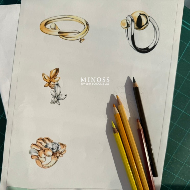 주얼리 컬러 렌더링을 잘하기 위해서는 우선 연필로 이렇게 꾸준히 연습하는 게 제일 중요합니다! 색을 사용하기 전 밝은 부분과 어두운 부분을 확실하게 잡는 방법과 손에 힘을 조절하는 법을 먼저 익혀야 하기 때문이죠 이제 연필 연습은 끝! 본격적으로 체색에 한 번 들어가 볼까요? 18K 골드를 채색할 때 사용하는 색연필은 총 4개입니다 (dedp yellow, yellow ochre, red ochre, van dark vrown) 밝아지는 부분은 손에 힘을 풀고 살살~ 어두운 부분은 확실하게 색상으로 눌러주기! 자 여기서 멈출 수는 없죠! 더욱 다양한 형태의 금속들을 그려보도록 할게요! 원기둥, 물방울 파이프 모양 그리고 평반지와 환반지 등등! 여러 가지 금속 형태....... <img src="https://blogthumb.pstatic.net/MjAyNjA0MjJfMjQ5/MDAxNzc2ODIyOTY2MzI5.WxI3wcFoCIUOnubNdilRaugIM9cza6LJy95rg10lPlUg.DJ3CCBVWEWTWuyrmFP7Gmmo0q58ex79Sg3_o2kWQ5qUg.JPEG/IMG%A3%DF5711.jpg?type=s3" />