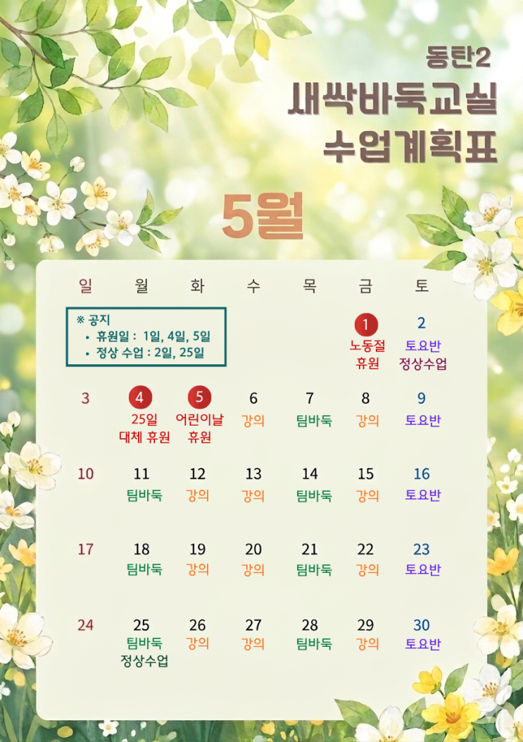 안녕하세요 동탄2새싹바둑교실입니다 ^^ 5월 수업계획표와 휴원 일정 참고해주세요. 휴원 : 1일(노동절) ,4일(25일 석가탄신일 대체), 5일(어린이날) 정상수업 : 2일(토요반수업), 25일(석가탄신일) <img src="https://blogthumb.pstatic.net/MjAyNjA0MjhfNDUg/MDAxNzc3MzUxNDQ1OTI4.dxip-wUtSo6BEE55ICqC1twZ6ihb7mh4Inv94wvQp-Ug.6odK2m7DIItSbOAGJJNCknECYJqDXKo5Z_4NWmQJuDMg.PNG/26%B3%E2_5%BF%F9_%BC%F6%BE%F7%B0%E8%C8%B9%C7%A5.png?type=s3" />