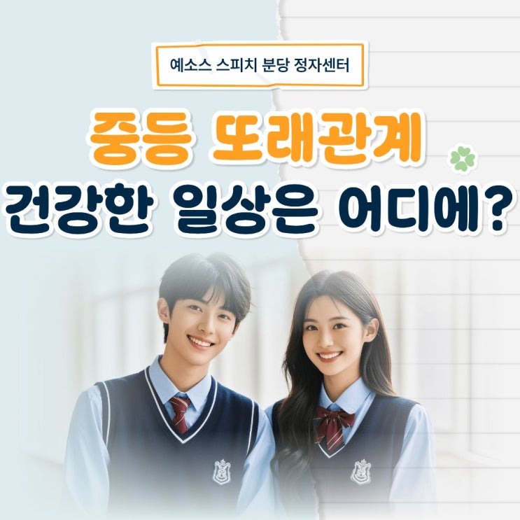 중학생 친구관계 왜 더 어려워졌을까요? 중학생 시기는 공부만큼이나 ‘사람 관계’가 중요한 시기입니다. 하지만 많은 아이들이 비슷한 고민을 합니다. “친구랑 갑자기 어색해졌어요” “이유는 모르겠는데 저만 빼고 노는 것 같아요” “말을 잘 못해서 오해가 생겨요” 이 시기의 관계 문제는 단순한 성격 문제보다 친구 대화법 즉 ‘소통하는 방법’을 배우지 못해서 생기는 경우가 많습니다. 그래서 최근 중등 스피치 수업은 단순 발표 위주의 수업이 아닌 ‘관계를 위한 말 하기’ 중심으로 바뀌고 있습니다. 특히 분당 스피치 예소스 스피치 분당 정자센터 중등 과정에서는 나를 알아가는 자존감 하브루타 수업 다가오는 AI 시대의 핵심....... <img src="https://blogthumb.pstatic.net/MjAyNjA0MTdfMTc5/MDAxNzc2NDE1NjE1MjY3.bC8T9vc4m_43iVD9Psys9tg93qgcZbqL8zl9lin_u-Ag.mWxsDq5KytWIEsECNVegiTRvlpAIUa9_PODoq6W2DEYg.JPEG/1.jpg?type=s3" />