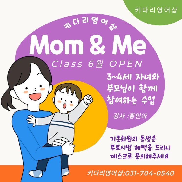 키다리영어샵 에서 Mom & Me 영어수업을 새로이 Open 합니다. 아직 분리수업이 어려운 3,4세 유아의 영어수업을 원하시는분들은 이번기회에 도전해 보세요. 기존회원의 동생은 무료시범혜택을 드리니 데스크로 문의주시기 바랍니다. Mom&Me수업시간은 위 시간표 참고 하시기 바랍니다. 시범수업 및 등록 문의사항 있으시면 데스크로 연락주세요. 키다리영어샵 031-704-0540 <img src="https://blogthumb.pstatic.net/MjAyNjA0MjNfMjQx/MDAxNzc2OTM1NTY0MzEw.j1JFCdmUpLTkeWhRqnZ0TbT713fdkvtPwYlGlQbiEkQg.-E8SeEcvWPiyUMnH5z9u5p8v3yX3iaIaT-Howq2admcg.JPEG/momme.jpg?type=s3" />