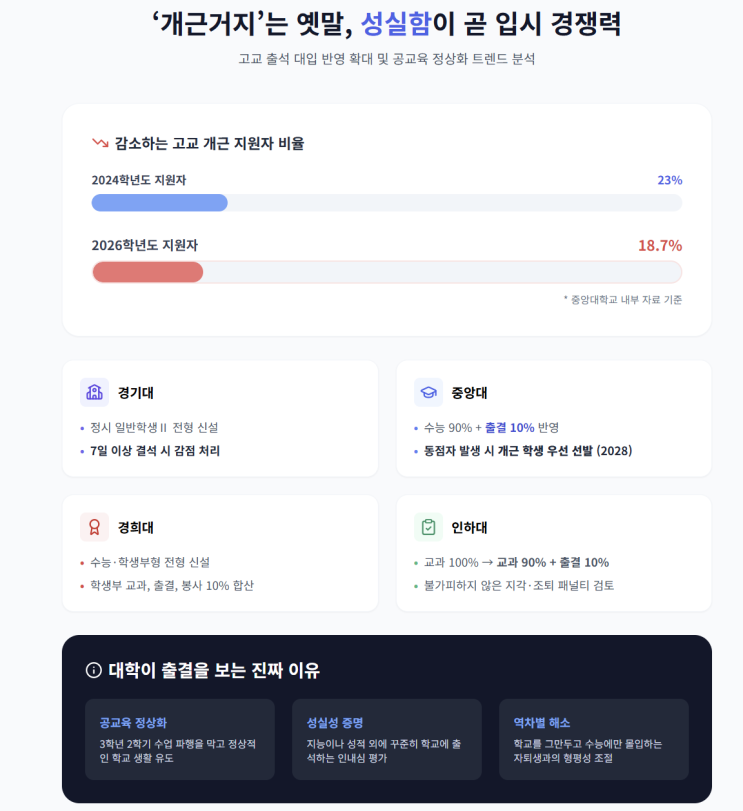 ‘개근거지’는 옛말! 대입 판도 바꾸는 ‘출결의 힘’ 최근 교육계에 큰 변화가 불고 있습니다. 한때 해외여행 등으로 학교를 빠지지 않는 학생을 비하하던 **‘개근거지’**라는 말이 무색하게, 주요 대학들이 고교 출결을 대입 전형에 정량적으로 반영하기 시작했습니다. https://youtube.com/shorts/uWsFaypfg3o?si=D0BWMwjaMNJurCZn 주요 대학별 반영 현황 중앙대·경기대: 당장 올해 입시부터 결석 일수에 따른 감점 및 출결 점수 환산 도입 경희대·인하대: 내년부터 정시 전형 등에 출결 반영 확정 동점자 처리: 중앙대 등은 2028학년도부터 동점자 발생 시 ‘개근 학생’을 최우선 선발할 예정입니다. 왜 출결이 중요해졌....... <img src="https://blogthumb.pstatic.net/MjAyNjA0MjVfMTI1/MDAxNzc3MDg2OTU4OTUx.HuHWy0umJWsOQiNqDwSvoXNF-uUcQZJVmiFwhICBuh0g.1aV4Jxt2C8z246yO7aDkdtB9CdFvJvSoUrRy8rpuRR0g.PNG/%BD%BA%C5%A9%B8%B0%BC%A6_2026-04-25_121510.png?type=s3" />
