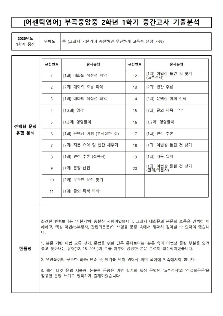 [산본영어학원/어센틱영어학원] 2026 부곡중앙중 2학년 1학기 중간고사 영어 총평