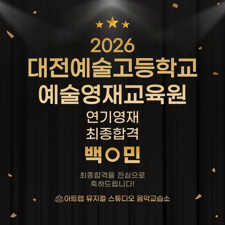 안녕하세요~ 아트랩 뮤지컬 스튜디오 음악교습소입니다. 오랜만에 전하는 소식입니다.^^ 저희 친구가 대전예고 예술영재교육원 연기 영재 과정에 최종 합격했습니다. 이 합격은 단순히 "한 번에 붙은 결과"가 아니기에 더욱 값지고, 더 깊은 의미를 가지고 있습니다. 2년 전 처음 도전에서는 아쉽게 결과를 얻지 못했고, 본인이 부족한 점을 채우고자 직접 저를 찾아 어머님을 설득했고, 저와 함께하게 된 친구입니다! 그리고 그다음 해에는 일정이 맞지 않아 도전조차 하지 못했어요. 그럼에도 불구하고, 멈추지 않았습니다! 포기하지 않았습니다!! 결과는 당당하게 합격이었죠!!! 저는 이 순간을 보며 다시 한번 확신했습니다. 한 번....... <img src="https://blogthumb.pstatic.net/MjAyNjA0MTRfMjMz/MDAxNzc2MDk3MzY1MzM2._u9_rusPT_BZnvvxkLs38PIqO87Ai5KfDniDuYWyuwsg.n-JD7Zm4mDzdmXZEQJ1xwl4cBIPKlTEBB9C2er2WV-Yg.JPEG/003.jpg?type=s3" />