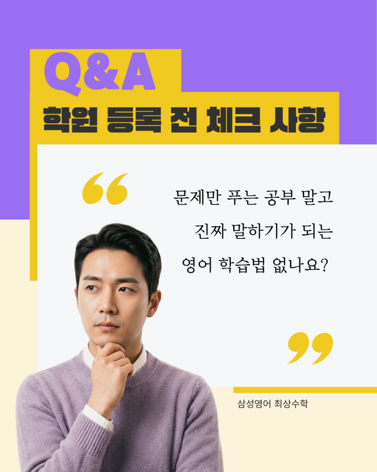 안녕하세요 명륜동 삼성영어최상수학입니다. <학부모 Q&A 콘텐츠> 세 번째 내용은 바로 초등 영어 회화 공부입니다. 영어 공부도 열심히 하고, 성적도 괜찮은데 유독 말하기 앞에선 입이 굳어버리는 우리 아이... 어떻게 공부해야 회화가 자연스러워질까요? 제2언어 습득 분야 전문가들의 연구에 따르면, 영어 말하기 실력을 향상시키기 위해선 아래 4가지 과정이 함께 이루어져야 합니다. (출처: 삼성영어셀레나 공식블로그) 1️⃣ 이해 가능한 수준의 영어를 충분히 듣고 읽는 것 2️⃣ 직접 영어를 입으로 내뱉는 훈련 3️⃣ 틀린 부분을 정확하게 바로잡아주는 피드백 4️⃣ 꾸준하고 일관되게 영어 말하기 환경 노....... <img src="https://blogthumb.pstatic.net/MjAyNjA0MjBfMTE1/MDAxNzc2NjY4NTE0OTIy.Zudlglghqwv98nwFZuBMx76_qiwVVbJR09_-e7e0dQAg.aJBUuqnSO5WpUpoB3FfEobfbzF6V3-honlvAYOMrQEUg.PNG/1.png?type=s3" />