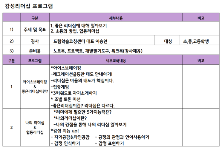 안녕하세요 드림학습코칭센터입니다. 세종소담중학교에서 진행된 ‘감성리더십캠프 현장을 소개드립니다! 이번 캠프는 단순히 듣는 강의가 아니라 “몸으로 참여하고 직접 느끼는 활동형 수업”으로 진행되었습니다. 프로그램은 이렇게 진행되었습니다 ✔ 아이스브레이킹 – 분위기 열기 ✔ 리더의 의미 토론 ✔ 감정 인식 활동 ✔ 쿵푸팬더1 영상 활용 수업 ✔ 나의 감정 & 나다움 발표 특히 가장 집중도가 높았던 시간은 쿵푸팬더 영상 활동이었습니다. 포가 “내가 용의전사라고?”라며 자신을 믿지 못하던 장면에서 아이들은 크게 공감했습니다. 그리고 마지막 장면 “특별한 것은 없다, 너 자신이 특별하다” 는....... <img src="https://blogthumb.pstatic.net/MjAyNjA0MDZfNDMg/MDAxNzc1NDU5MDkwMTA5.pulse8opG7CwnIDdeOsG0UKQP0c5wZoCMMQPXVrYe74g.AozMuuH8Ihw_zT42huPO2eN73k9-z8l4Zzpo_XN9D2gg.PNG/image.png?type=s3" />