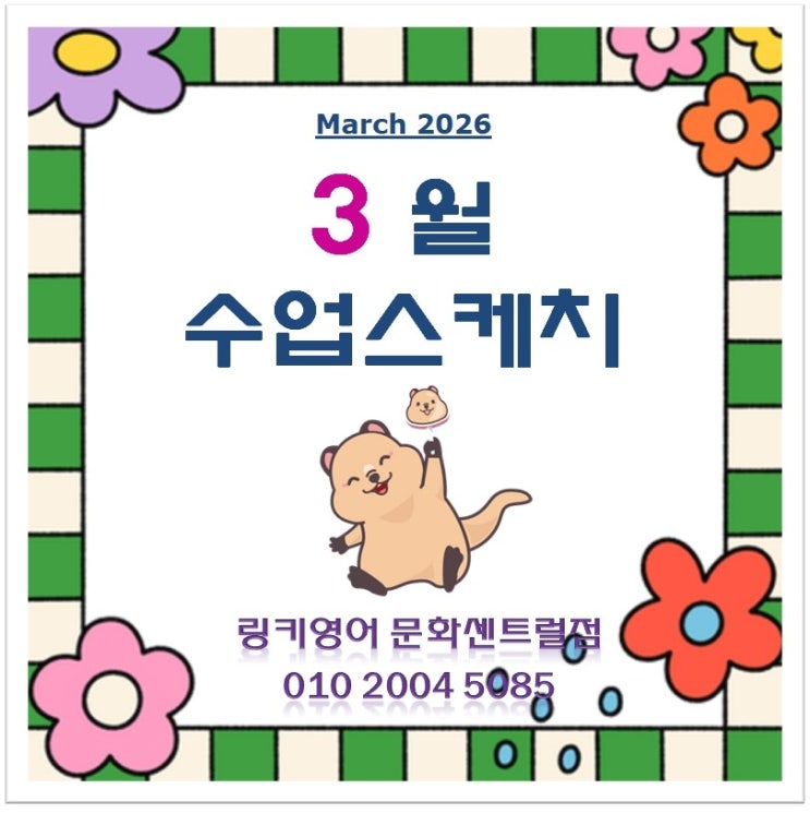 안녕하세요~ 링키영어 문화센트럴 써니원장입니다. 싱그러운 봄입니다^^ 새학기를 맞이한 우리 링키즈들의 신나는 3월 수업 속으로 들어가보겠습니다. 링키영어 에서 영어를 처음 시작하는 유치부 친구들은 메인 커리큘럼 중 가장 기초단계인 부터 시작합니다. Happy Birthday 3월에는 동물이름과 Action verb 행동을 나타내는 어휘와 표현에 대해서 배워보았습니다. Stage1 의 학습목표는 영어를 '공부'로 느끼지 않고 재미있고 자연스럽게 언어처럼 받아들여지는 것 입니다. 스토리텔링으로 자연스럽게 상황을 인지하고 Storybook Workbook Activity Sheets Drillbook 과 그외 다양한 멀티수업....... <img src="https://blogthumb.pstatic.net/MjAyNjA0MTFfOTcg/MDAxNzc1OTA0Mzk0MzM4.DoEA8CsPU1yARhkKh1CJ4VvdysJ-cHCdSpfN6vQlJ0Eg.vpmG92pdOsIirXBk2O5weEMxTGmH_E6M-SmZyP2BfgQg.JPEG/1775904393536.jpg?type=s3" />