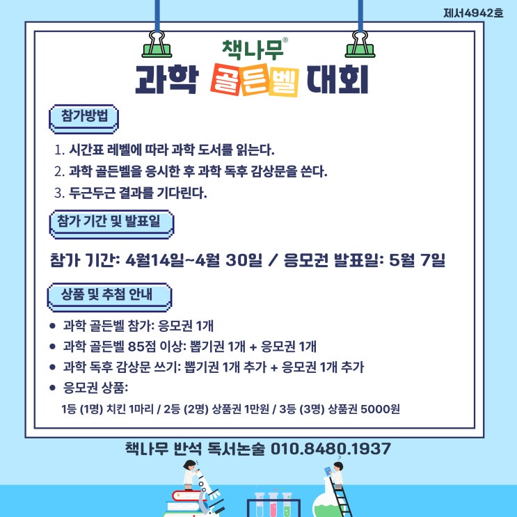 안녕하세요 책나무 반석 독서학원입니다. 과학의 달을 맞이하여, 아이들이 즐겁게 과학 책을 읽고 감상문을 쓸 수 있도록 책나무 과학 골든벨 행사를 진행합니다. 다양한 과학 도서를 읽은 후 개념을 확인할 수 있는 과학 골든벨 문제를 응시하고 과학 독후 감상문으로 논술할 수 있도록 아이들이 아주 즐거워 하는 골든벨 응모 이벤트를 진행할 거예요~ 우리 아이들의 마음 속에 지식이 쑥쑥 자라길 바랍니다. 교육문의: <img src="https://blogthumb.pstatic.net/MjAyNjA0MTRfMTk1/MDAxNzc2MTQyMjIzMTI3.7xmatEGrcPYkxY4jsrdIYfuuZGdOgBpfMbhJ1jtCOBcg.nz9fNWCjTRAxp00izbOs8vnsf3Fe2AlJkjKHB9pueIog.JPEG/%C1%A6%B8%F1%C0%BB-%C0%D4%B7%C2%C7%D8%C1%D6%BC%BC%BF%E4__%BA%B9%BB%E7%BA%BB-002.jpg?type=s3" />