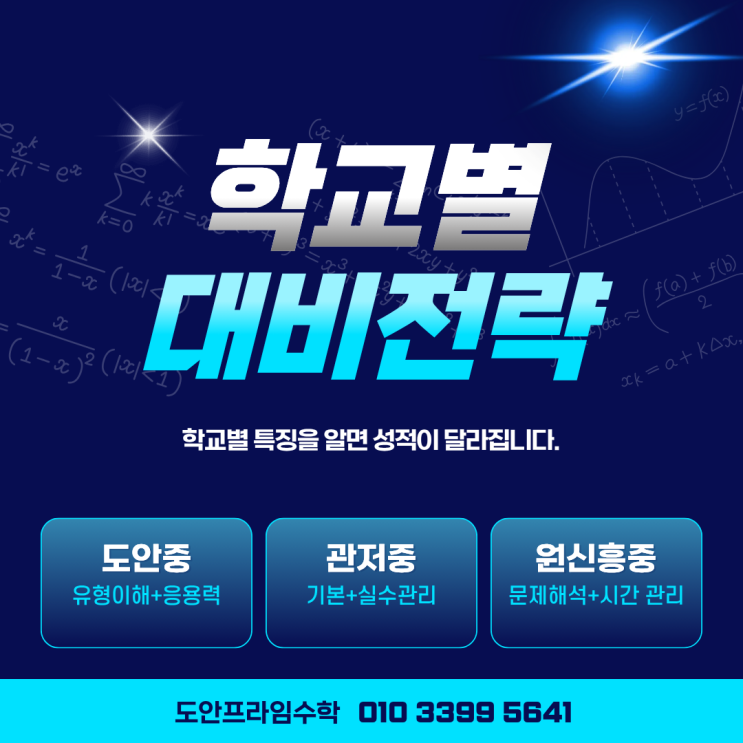 학교별 특징을 알면 성적이 달라집니다. 중간고사가 다가오면서 가장 많이 듣는 질문이 있습니다. “우리 아이 학교는 어떻게 준비해야 하나요?” 수학은 같은 단원을 배우더라도 학교별로 시험 스타일과 출제 방식이 다르기 때문에 준비 방향이 달라져야 합니다. 관저중, 도안중, 원신흥중. 각 학교별 시험 대비 전략을 정리해드리겠습니다. ■ 도안중 – ‘유형 이해 + 응용력’이 중요합니다 도안중은 단순 계산 문제가 아니라 유형을 변형한 문제, 응용 문제가 자주 출제됩니다. 겉으로 보기에는 익숙한 문제인데 막상 풀어보면 막히는 경우가 많습니다. “개념은 아는데 점수가 안 나오는” 학생이 많은 이유입니다. ▶ 대비 전략 개념 암기....... <img src="https://blogthumb.pstatic.net/MjAyNjA0MTZfMTgw/MDAxNzc2MzQyNzg3NzE1.K2bUa3JBzRKgudv1q9h2z-s1CDPDAPlA9WqzB6Wr6Lsg.ilKQCMtBQ1uHF7caqLG8rCUQuYvsGj_-Le0XxAdTn7Eg.PNG/%C7%D0%B1%B3%BA%B0.png?type=s3" />